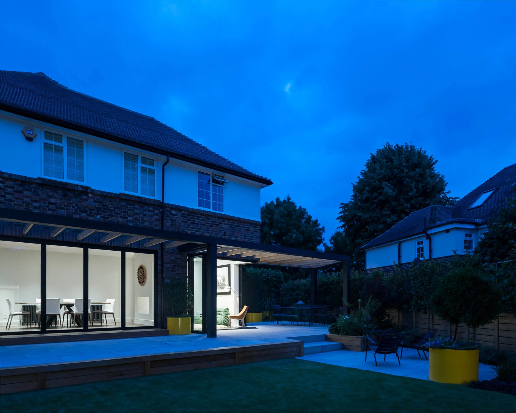 The extension houses a large kitchen and family room which opens up to the garden with floor to ceiling glazing with a slim roof profile and large roof lights to create a bright new space.