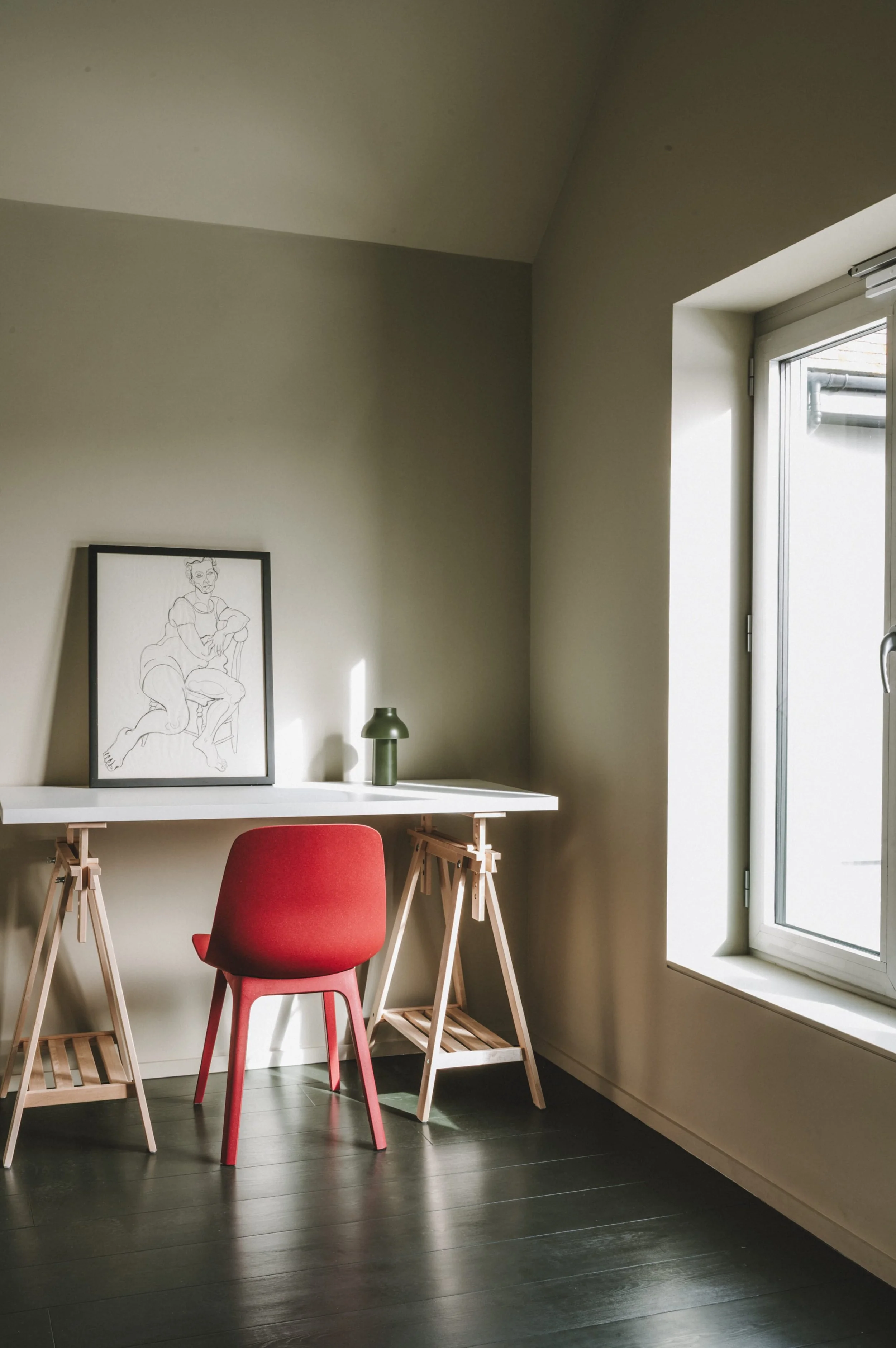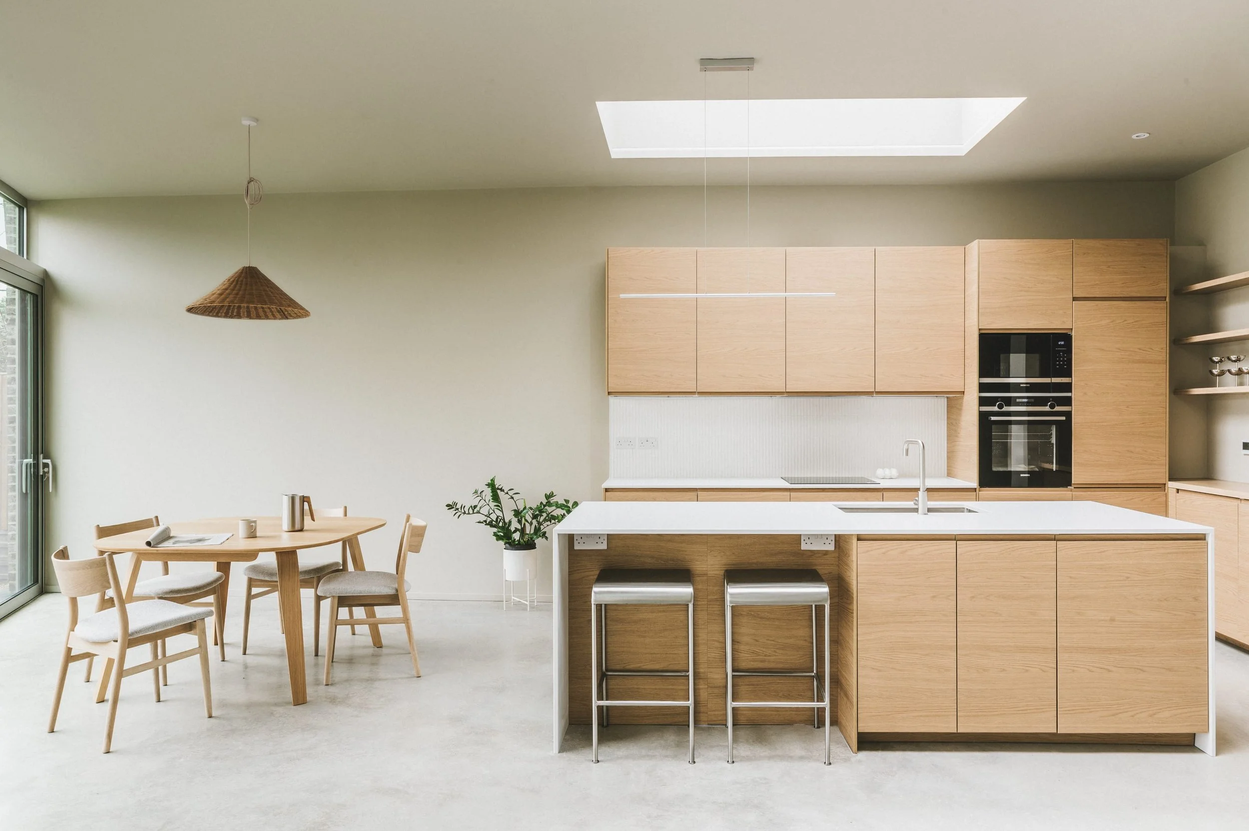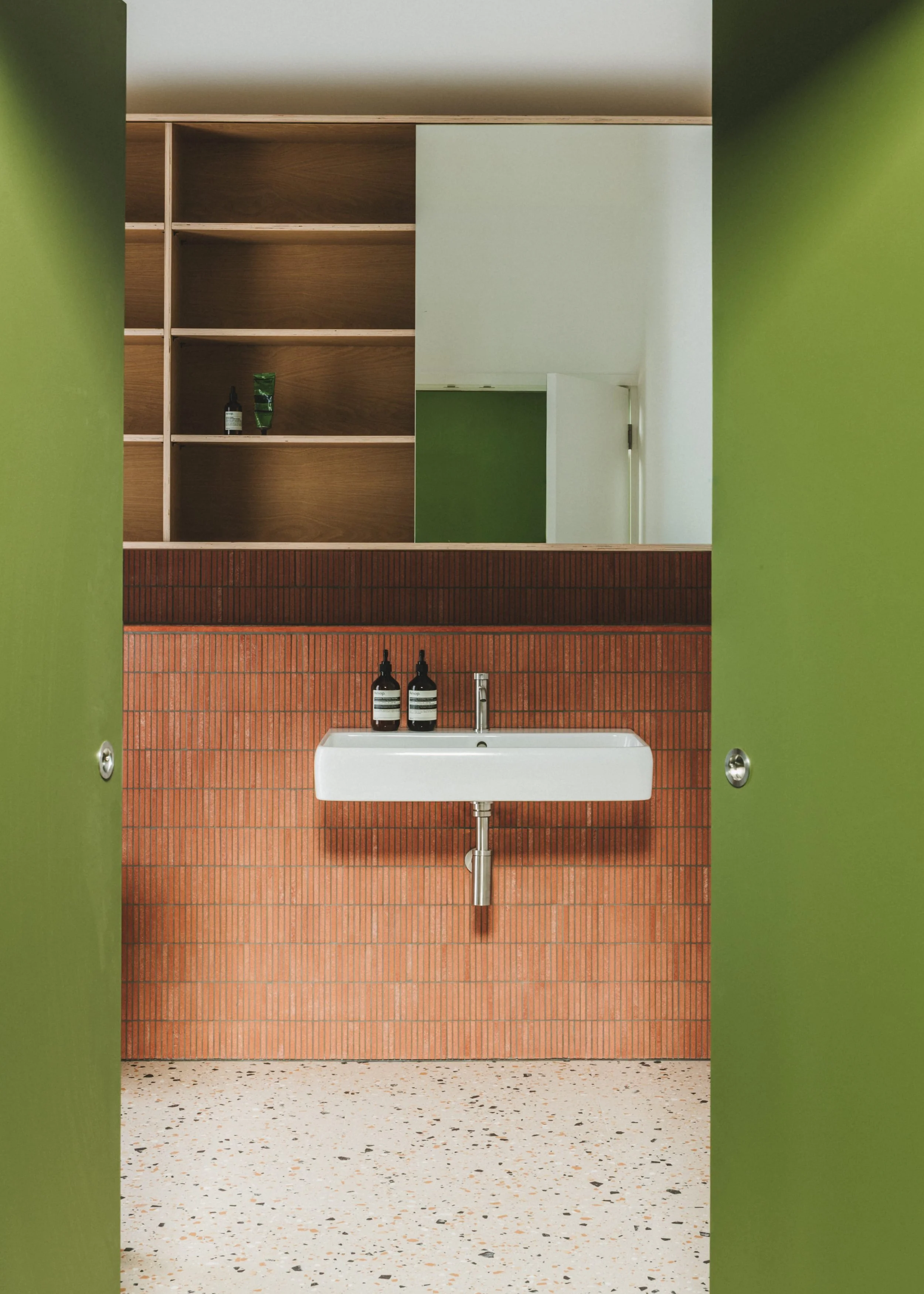 We enjoyed designing the interior on the project, including bespoke joinery and the specification of all finishes, colours and furniture. Whilst the main living spaces follow the neutral palette of the brief, we introduced carefully chosen moments of material richness including terracotta tiles, olive green paintwork, oak joinery and terrazzo flooring to give the bathrooms and ancillary spaces their own distinct character.