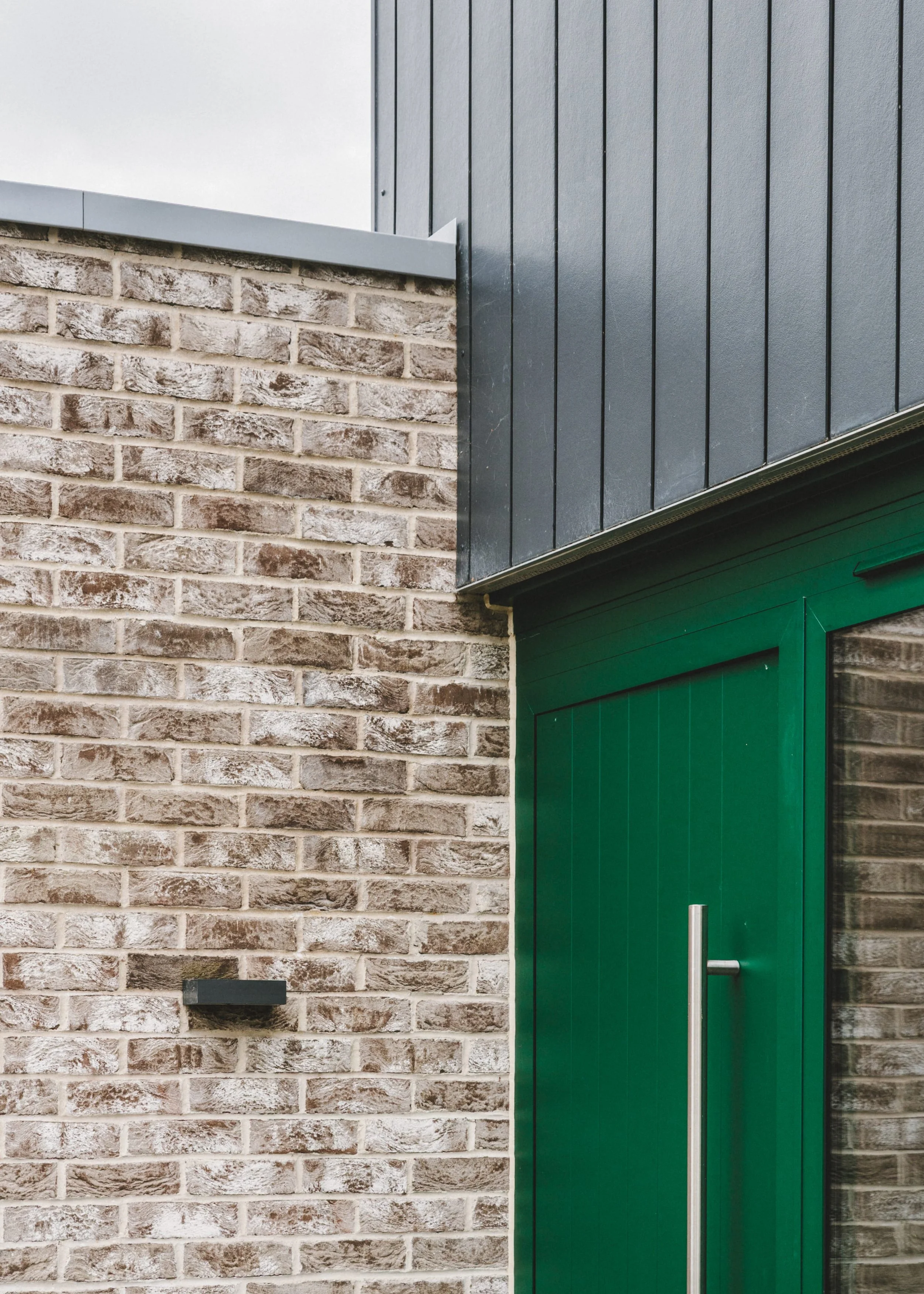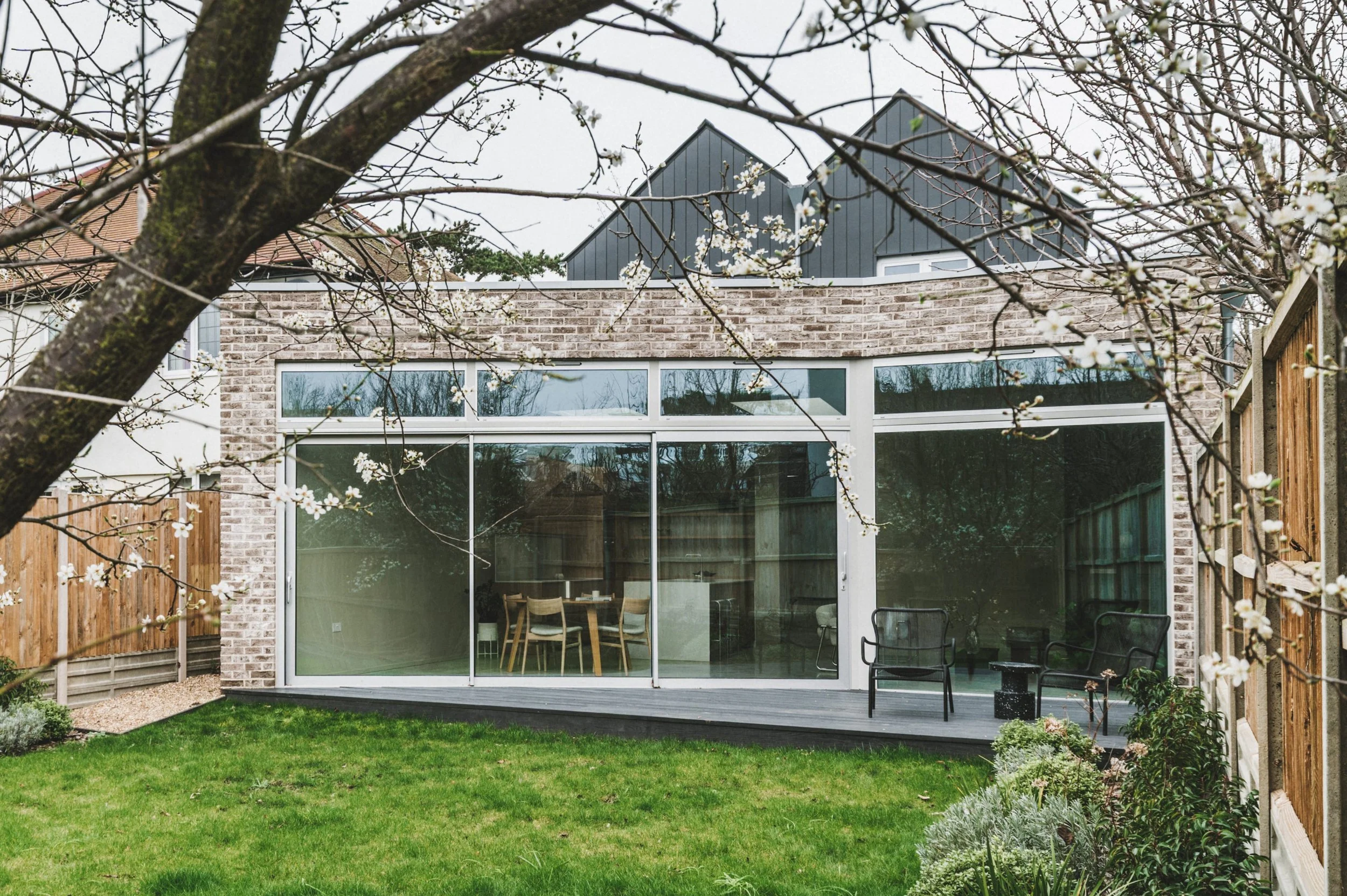 In form, the building takes its cues from its surroundings, complementing the scale and character of the adjacent property while the dark-clad façade set above a warm brick base gives the house a confident street presence. The twin gables echo the roofline next door without mimicking it. Full-height sliding glazing to the rear opens the living spaces directly onto the garden, with polished concrete floors running throughout the ground floor.